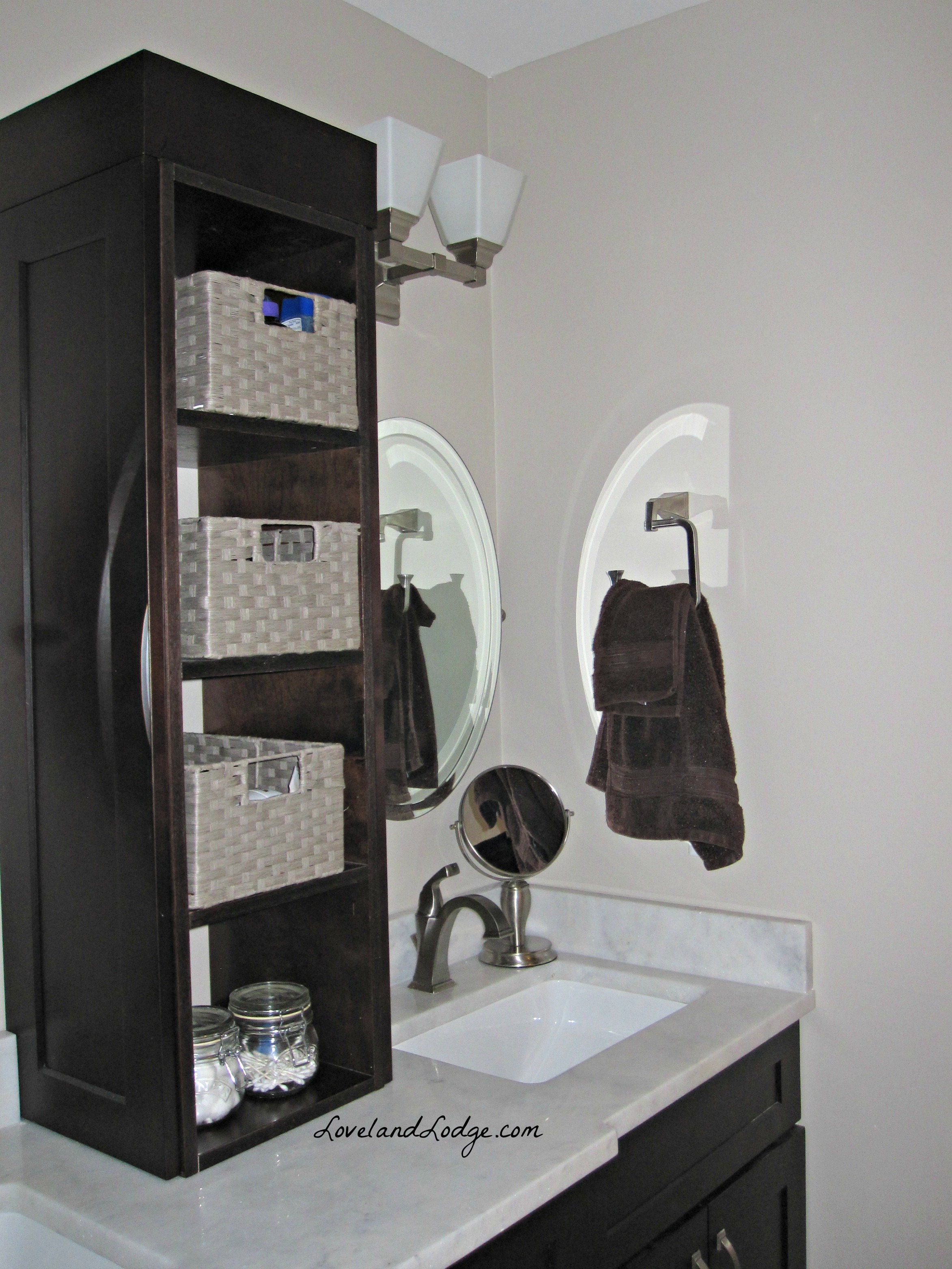 It took me more time at Home Goods than I care to admit to find three matching baskets that were the right size. I finally found these in the dog section and took out the paw print lining. The top one holds medicine, the middle my hair supplies and the bottom one, my make-up. We keep tooth brushes, cotton balls and Qtips on the bottom shelf.