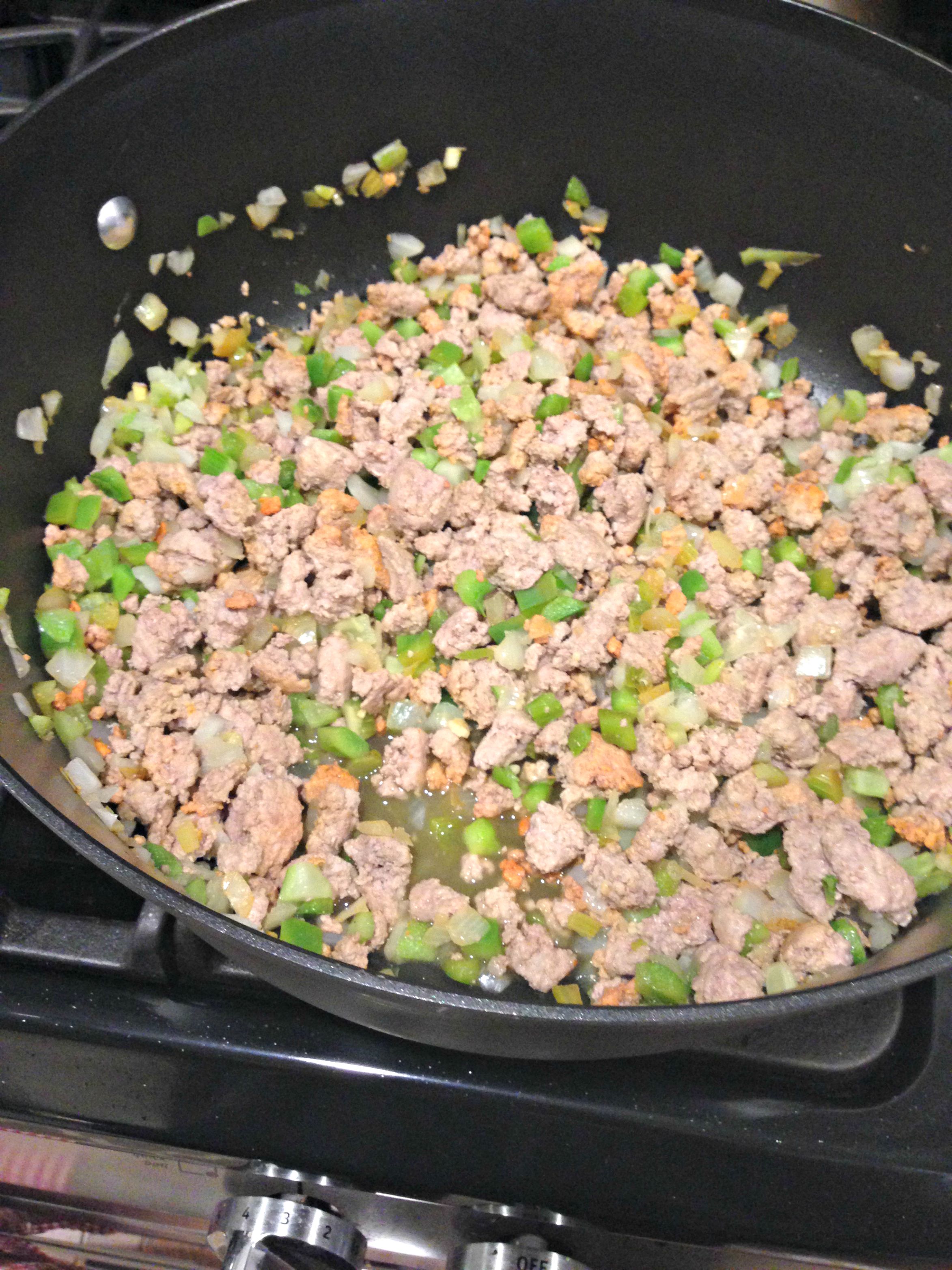 - When turkey is mostly cooked, add onion & green pepper; cook for 3 minutes until turkey is fully cooked and onions are translucent