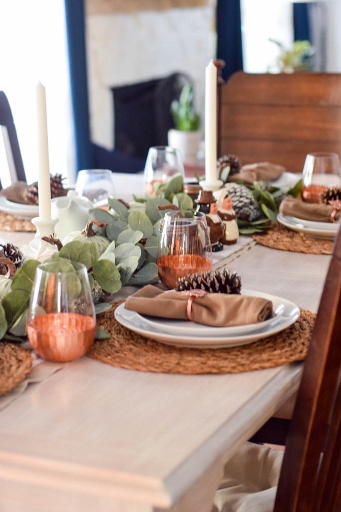 Instead, I ran to Target and purchase two strands of the Hearth & Hand eucalyptus garland. I planned to upgrade some of my garland for Christmas anyway so I figured why not go ahead and use it for Thanksgiving too. Other than the garland, everything else on the table I already owned.