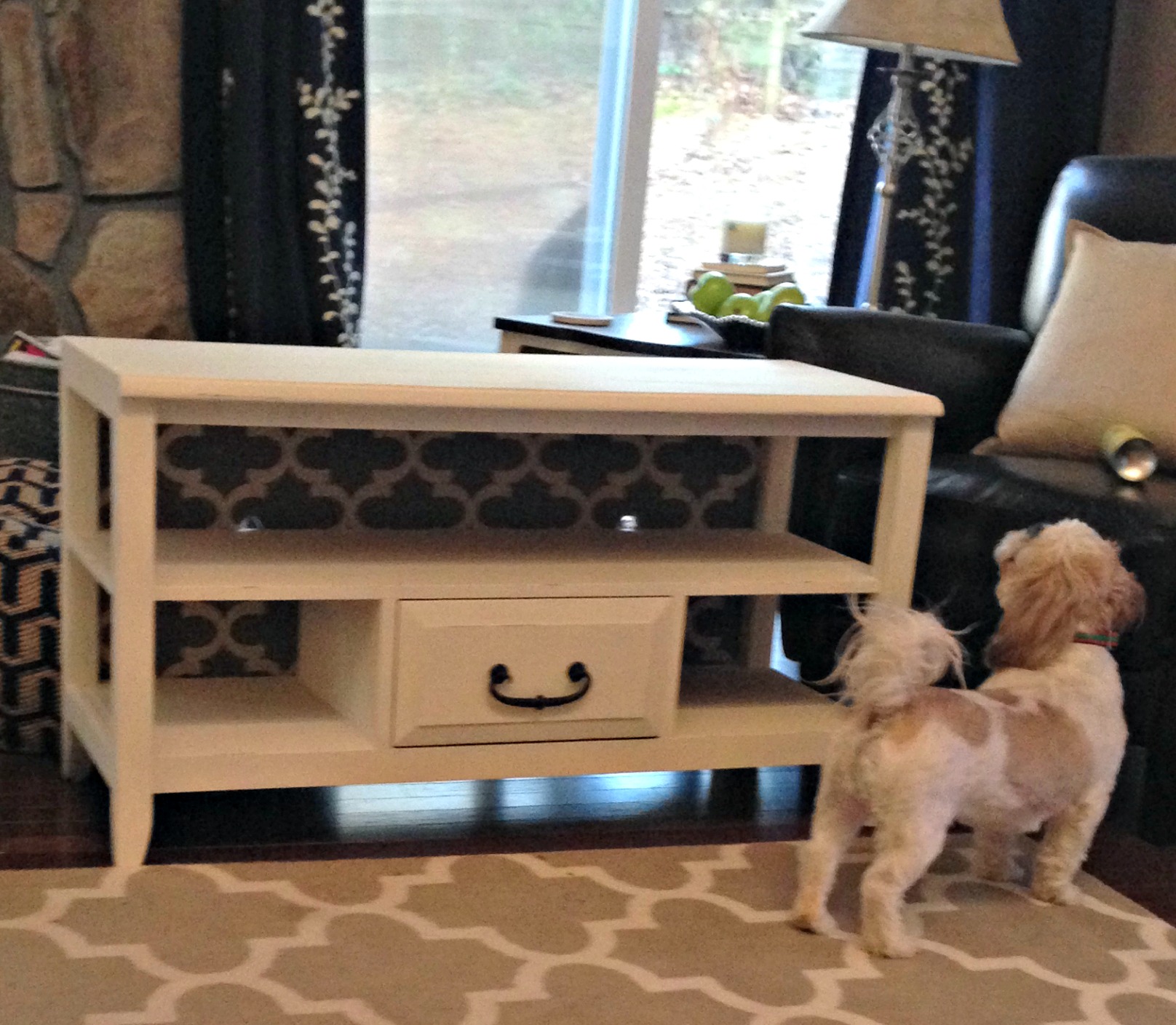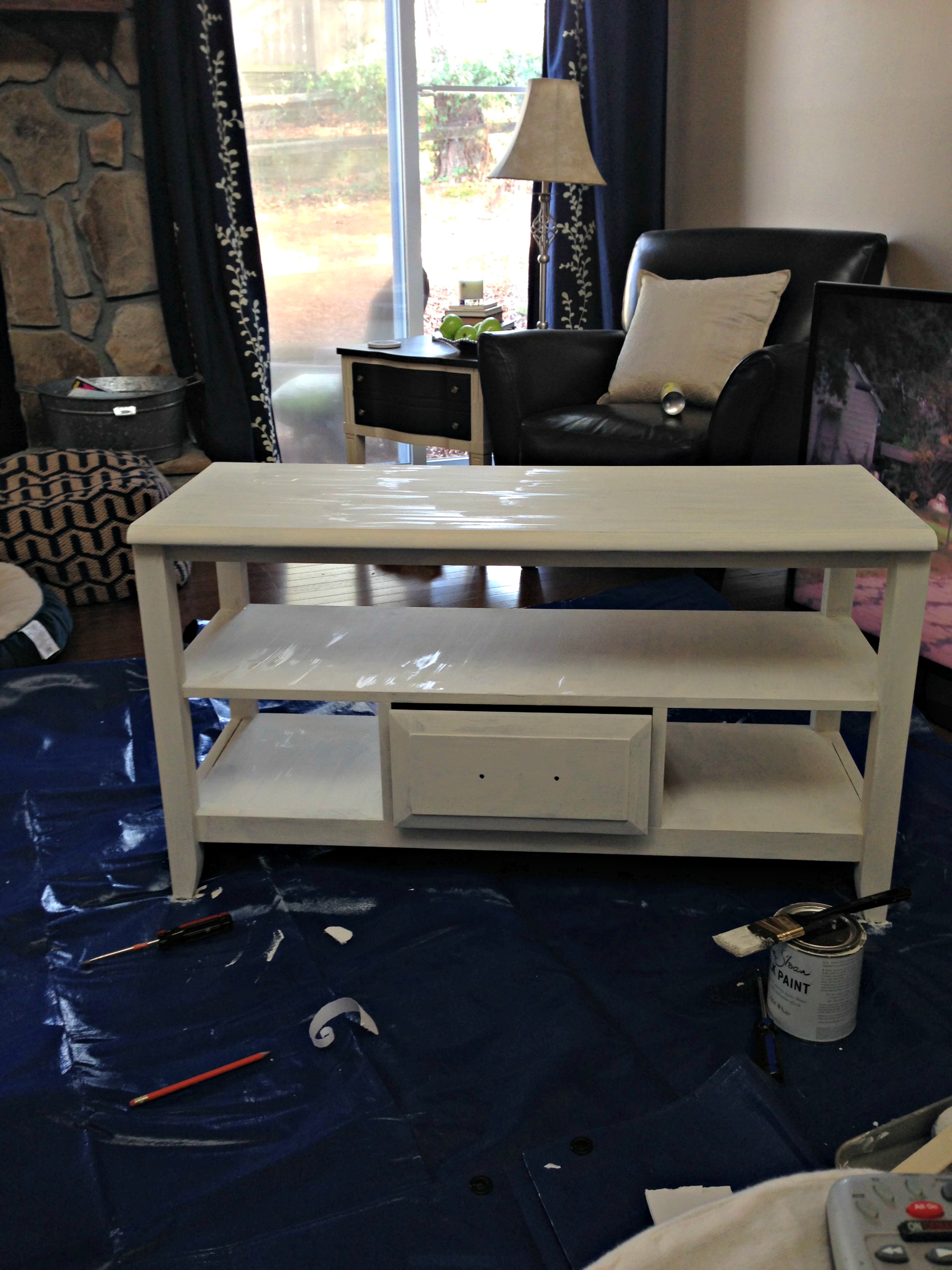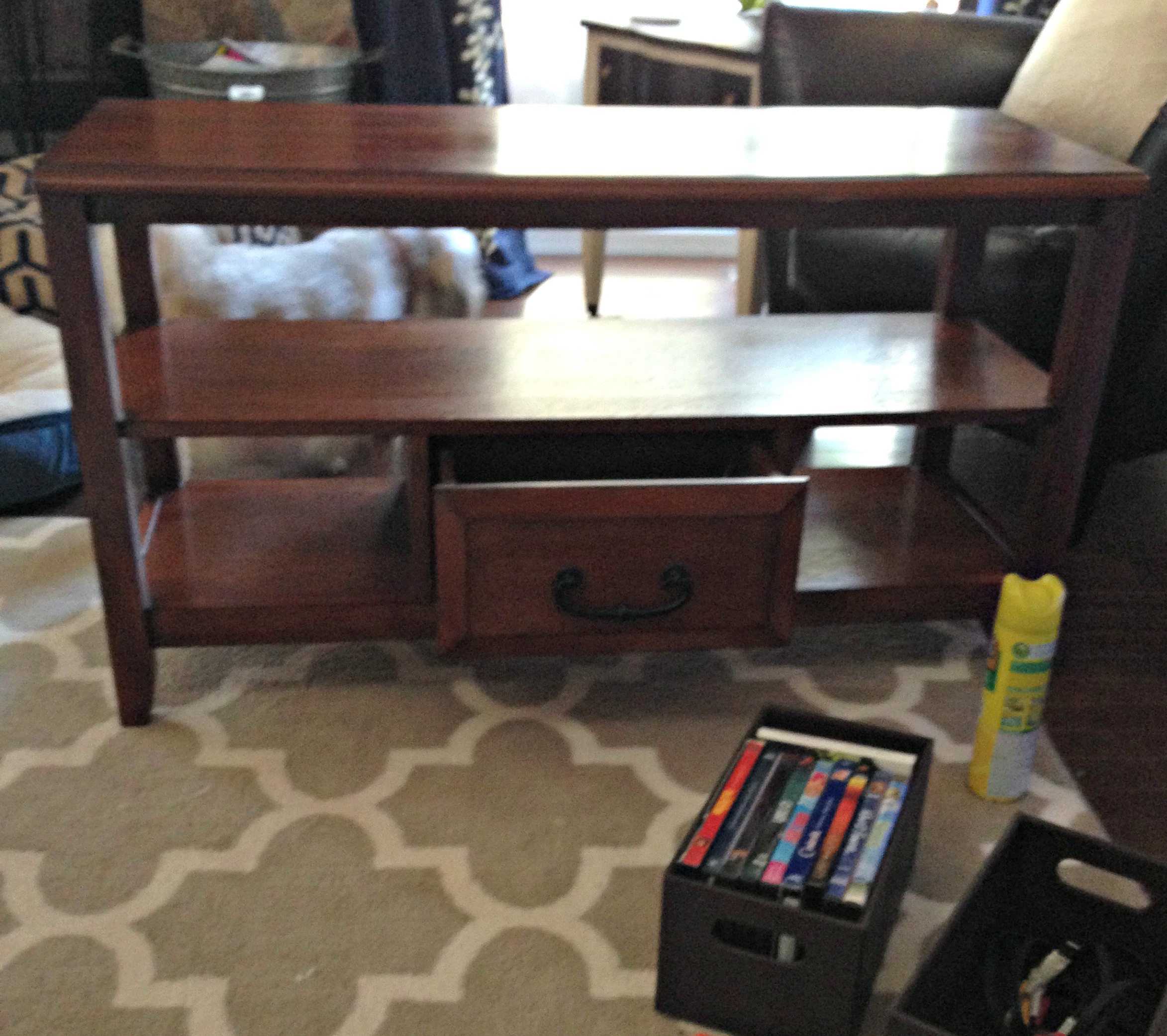 When I bought my condo at the end of 2009, I purchased a TV stand from Pier 1 that was perfect for my living room and my 30ish inch TV. Fast forward a few years later, and while I still loved the style of the TV stand, the brown original color didn’t work in our new house (too much brown on one wall with the club chairs) and I’d always been annoyed that it had an open back and you could see all the wires, no matter how hard I tried to organize them.
